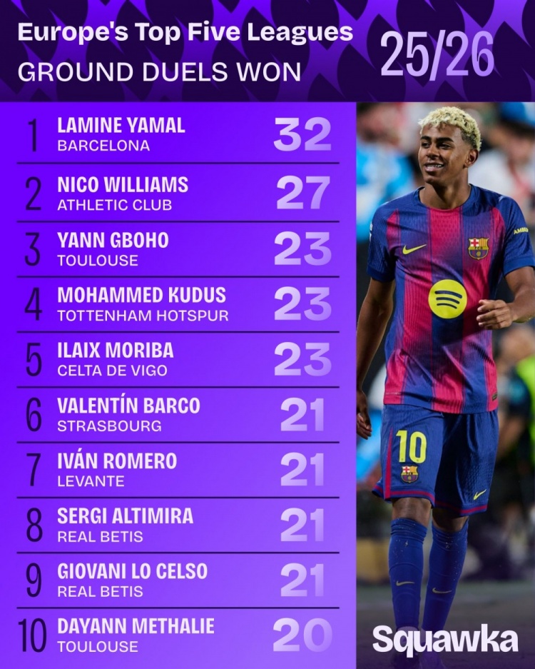 9月12日讯 Squawka统计了本赛季球员在五大联赛的地面对抗成功次数,并列出榜单。
